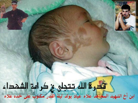 المعجزات الإلهية على خده الايمن وهى عبارة عن اسم عمه - علاء - الذي استشهد مع اثنين من رفاقه قبل سبعة اشهر برصاص الوحدات الاسرائيلية الخاصة وسط المدينة . ويربط جده ما حدث بكرامات الشهداء ويشير الى ان ولادة حفيده تاخرت لاكثر من شهر كامل قبل ان يولد فى ليلة القدر من شهر رمضان وفى اقل من عشر دقائق. وحول اثر هذه المعجزة يتحدث الجد عن الاف الزوار الذين جاءوه من كل المحافظات الفلسطينية الاخرى ويصف حالة الذهول و الدهشة لدى كثيريين حدقوا طويلا و بكوا طويلا امام ذات المشهد. ويبدو اسم - علاء - مكتوبا بلون بنى مميز وخط عربى جميل وباحرف واضحة وعريضةعلى الخد الايمن للطفل علاء بينما تختفى الهمزة خلف اذنه الصغيرة
