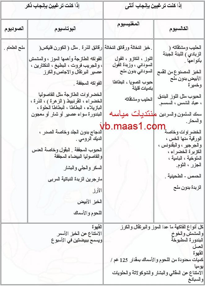 ولإتباع هذه الطريقة فعلى السيدة إتباع حمية غذائية لمدة زمنية لا تقل عن الشهرين تدعم بها المخزون الغذائي الذي يشجع الجنس المرغوب به ونرفق جدولا غذائيا يوضح المصادر الغذائية للكالسيوم والمغنيسيوم والبوتاسيوم والصوديوم.