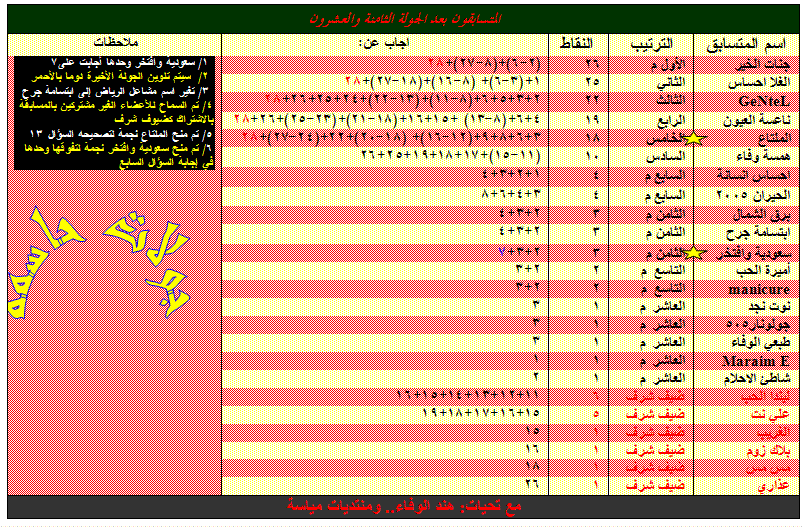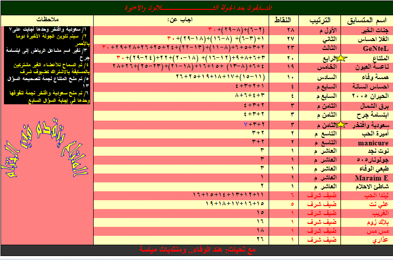 شكراااااااااااا لك هند علي مجهودك الاكثر من راااااائع بالمسابقة والذي تميزت به المسابقة من تنوع في مالات الاسئلة وجعل هناك روووح منافسة بيننا للبحث والاطلاع